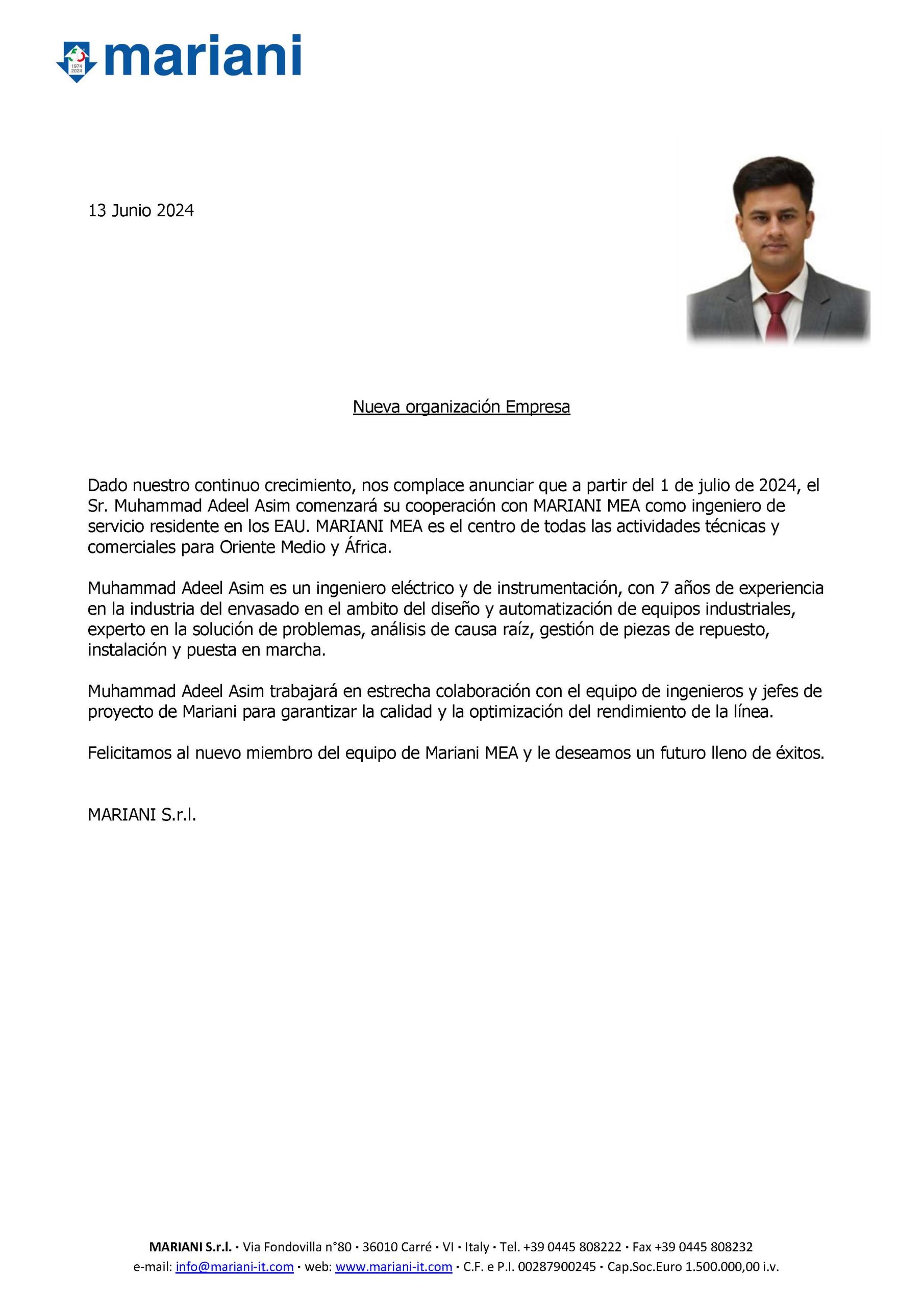 Dado nuestro continuo crecimiento, nos complace anunciar que a partir del 1 de julio de 2024, el Sr. Muhammad Adeel Asim comenzará su cooperación con MARIANI MEA como ingeniero de [...]
